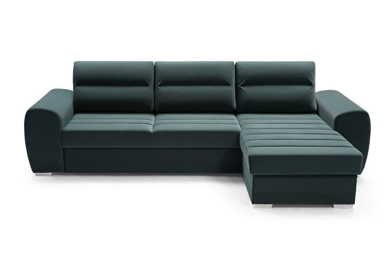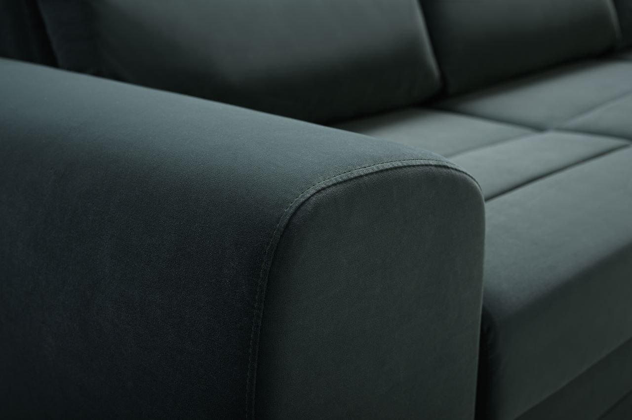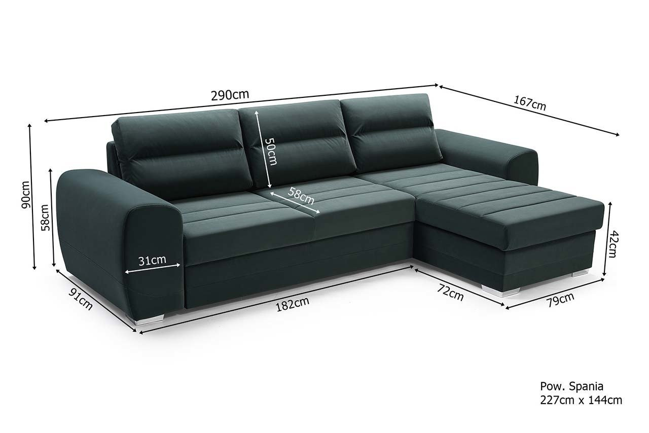 Rozłożysty narożnik z funkcją spania świetnie nadaje się do obszernego salonu utrzymanego w nowoczesnym stylu. Praktycznym elementem są zarówno poduszki jak podłokietnik znacząco poprawiający wygodę. Zastosowana pianka nie odkształca się, dzięki czemu narożnik zachowuje estetyczny wygląd przez długi czas użytkowania.
