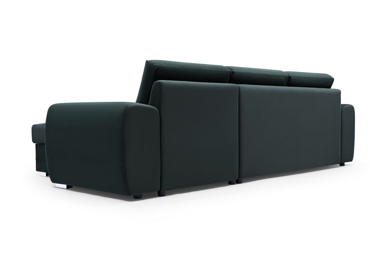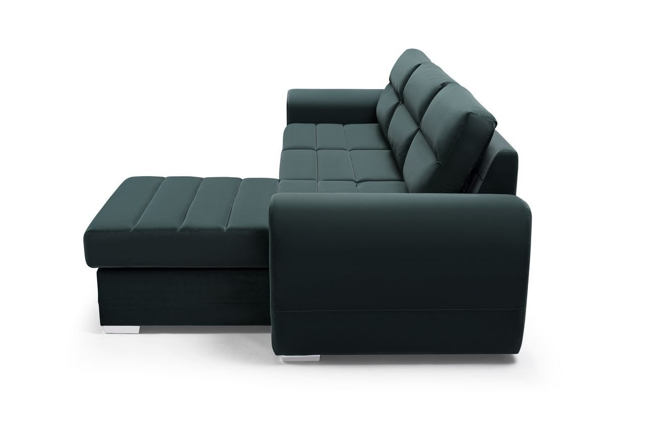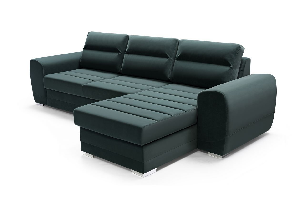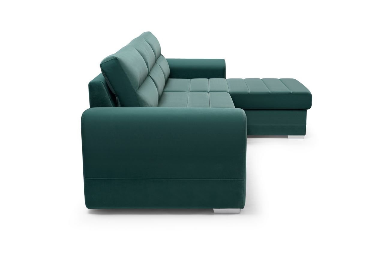 Rozłożysty narożnik z funkcją spania świetnie nadaje się do obszernego salonu utrzymanego w nowoczesnym stylu. Praktycznym elementem są zarówno poduszki jak podłokietnik znacząco poprawiający wygodę. Zastosowana pianka nie odkształca się, dzięki czemu narożnik zachowuje estetyczny wygląd przez długi czas użytkowania.