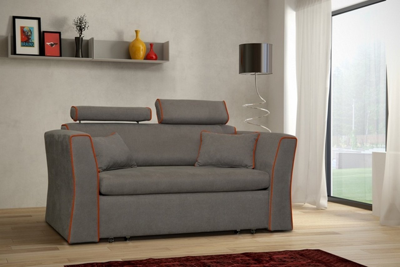Sofa z regulowanymi zagłówkam, kontrastowe lamówki podkreślają jej nowatorski styl.