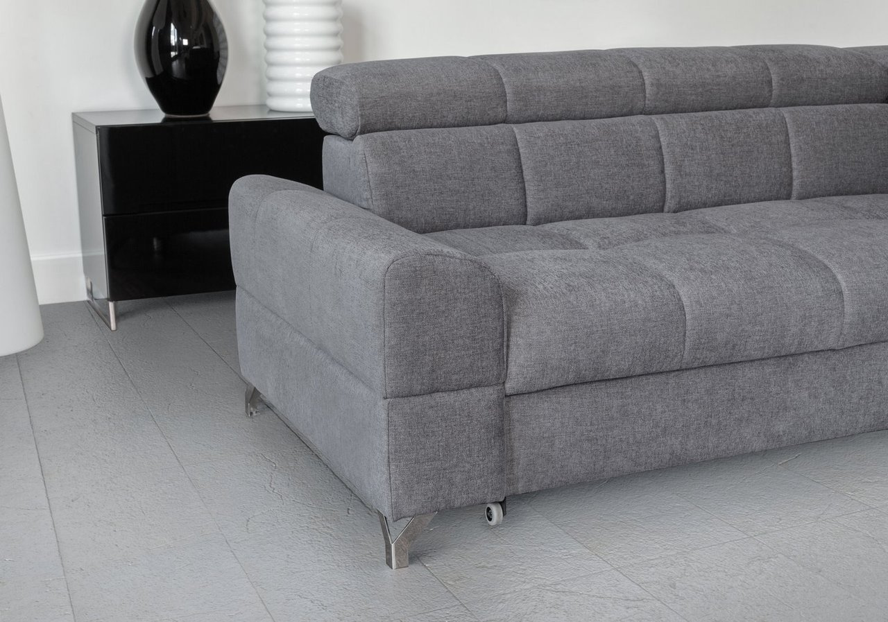 Atutem prezentowanego narożnika jest wysoka jakość wykonania. Producent zadbał o odpowiednie wyprofilowanie oparcia, które gwarantuje kręgosłupowi wygodne ułożenie. Dodatkowo możliwa jest także regulacja zagłówków, dzięki czemu użytkownik ma możliwość idealnego dopasowania ich kąta nachylenia do swoich preferencji. Pokrycie nie tylko doskonale się prezentuje i jest przyjemne w dotyku, ale przede wszystkim jest solidne i trwałe.