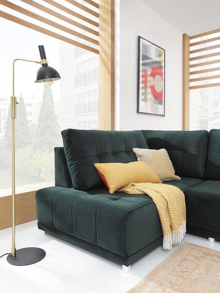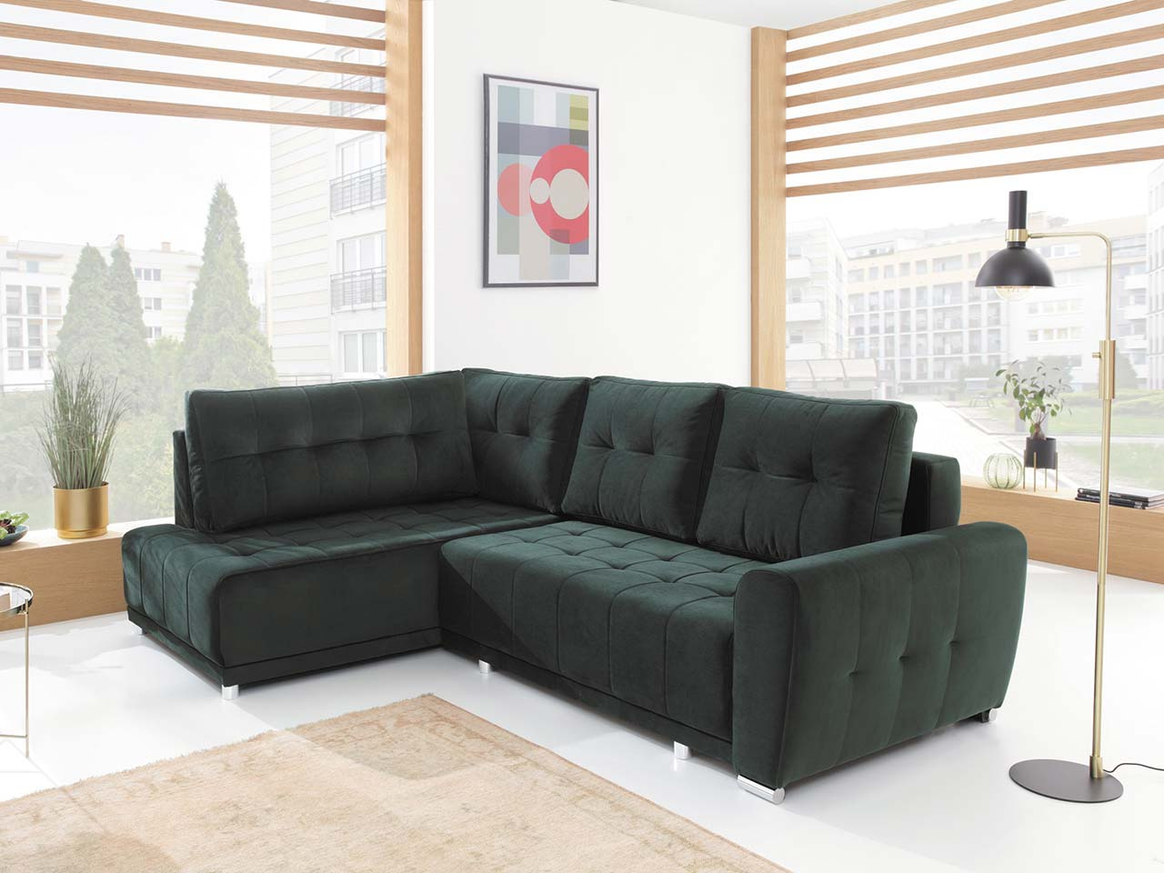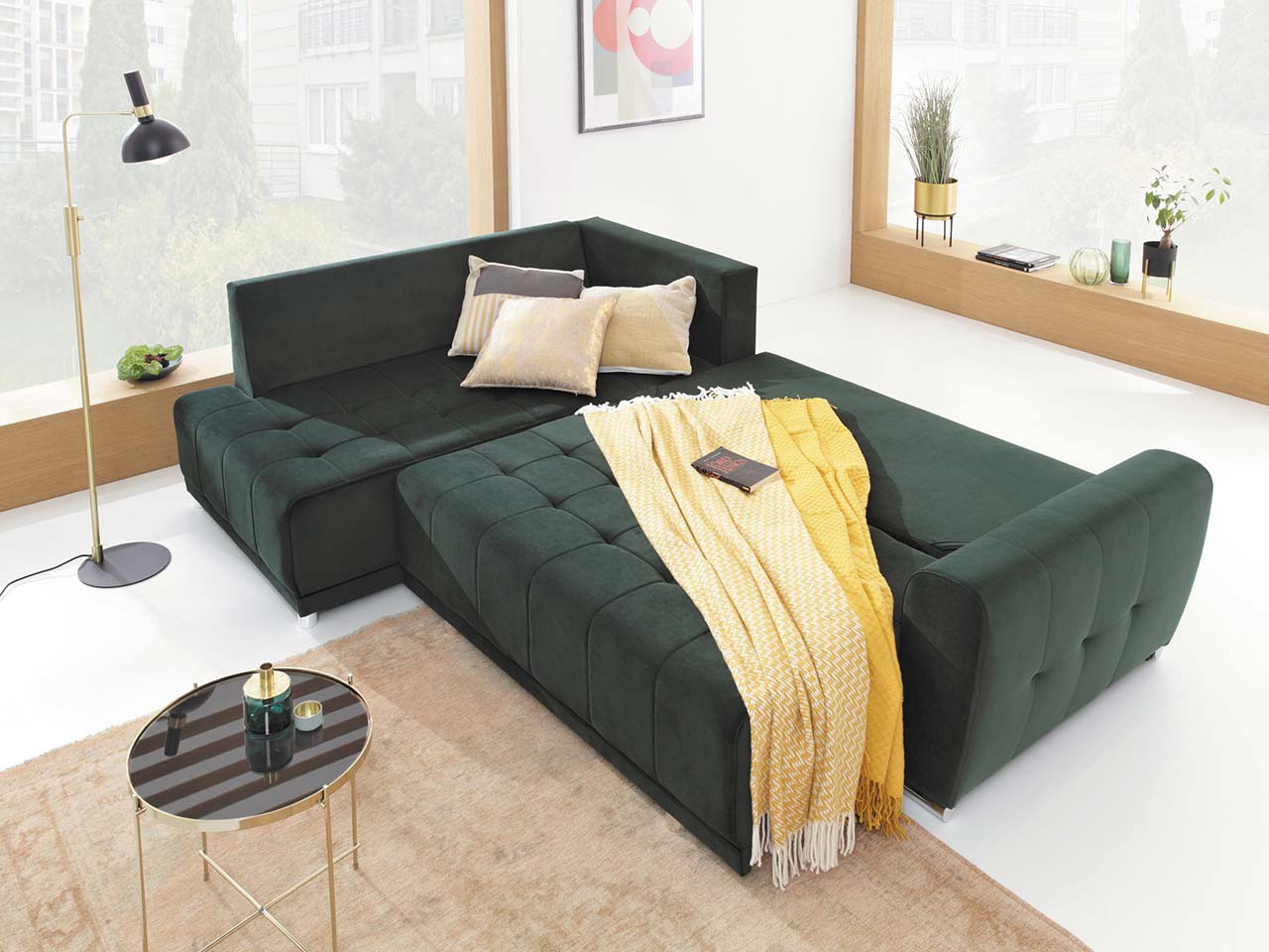 Nowoczesny pikowany narożnik z funcją spania i pojemnikiem na pościel, pasuje idealnie do poloju lub salonu.