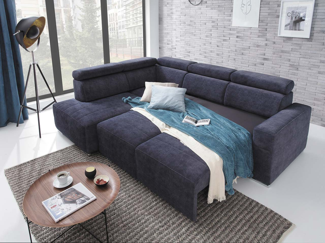 Nowoczesny narożnik z funcją spania i pojemnikiem na pościel, pasuje idealnie do pokoju lub salonu.