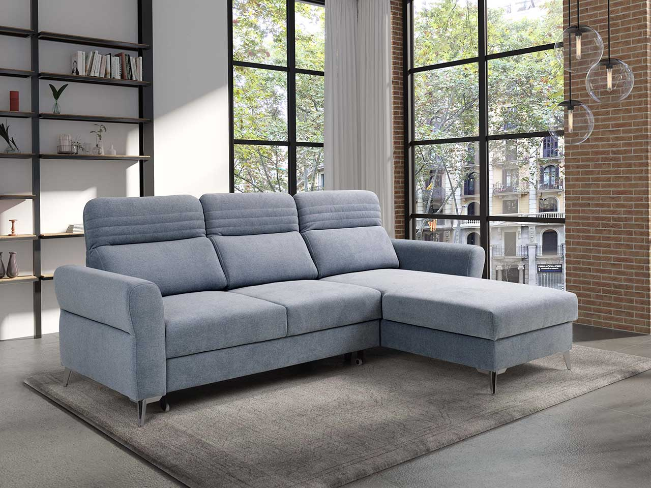 Narożnik CALABRIA z pojemnikiem na pościel, sprężyną falistą, regulowanymi zagłówkami, pianką wysokoelastyczną HR i systemem rozkładania Delfin to mebel, który zapewni nie tylko wygodę, ale również funkcjonalność i elegancki wygląd.