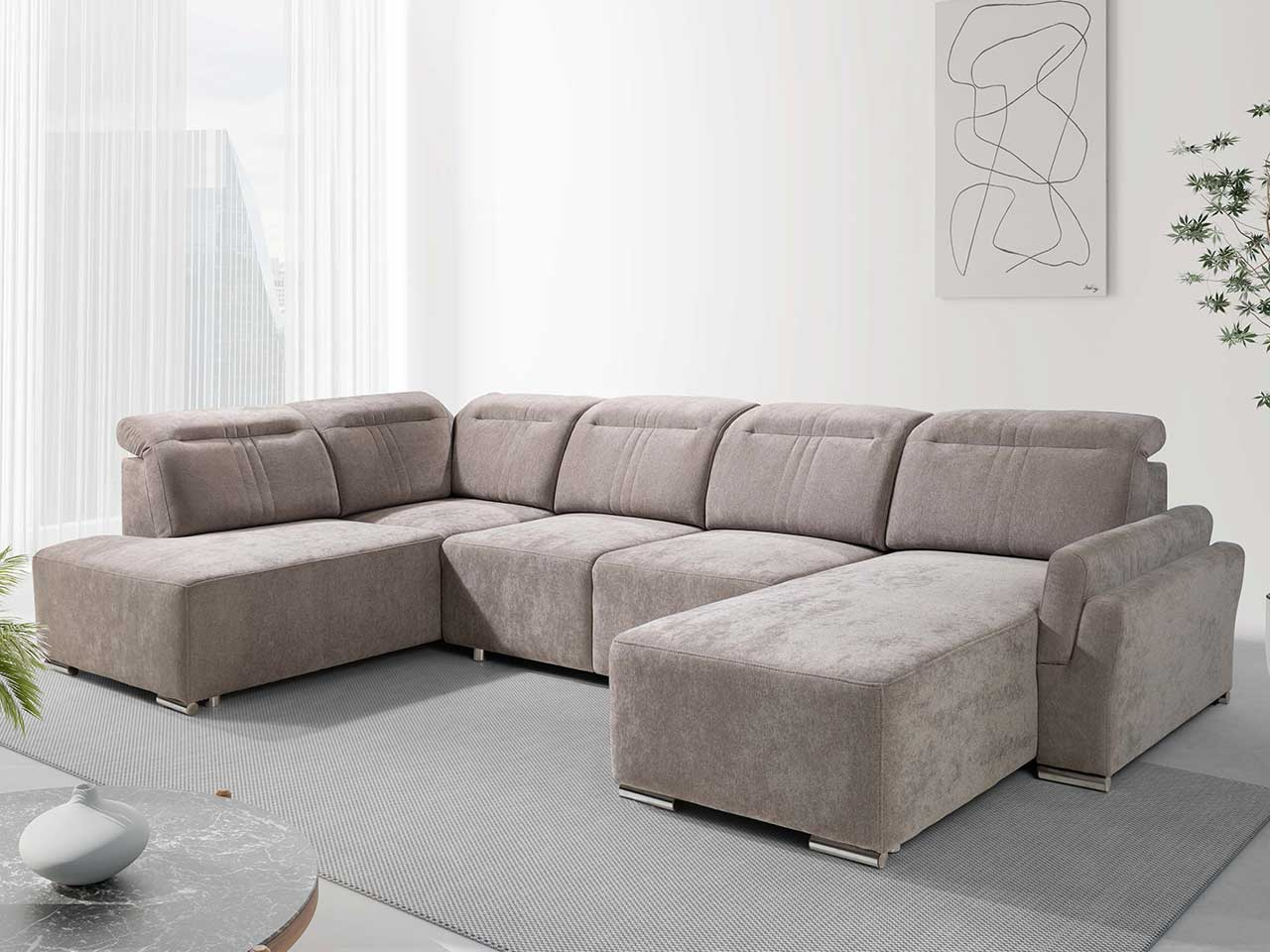 Podnośnik gazowy w skrzyni ułatwia otwieranie i zamykanie pojemników na pościel, co z kolei zwiększa komfort użytkowania mebla. Regulowane zagłówki pozwalają na dostosowanie kąta nachylenia podczas siedzenia, co pozwala na jeszcze lepsze dopasowanie do indywidualnych potrzeb użytkownika. Narożnik U to mebel, który poza swoimi funkcjonalnymi zaletami, prezentuje się również bardzo elegancko i stylowo. Dzięki temu, że posiada dwa boki, może zostać postawiony w różnych konfiguracjach, co pozwala na dostosowanie do wielkości i kształtu pomieszczenia.