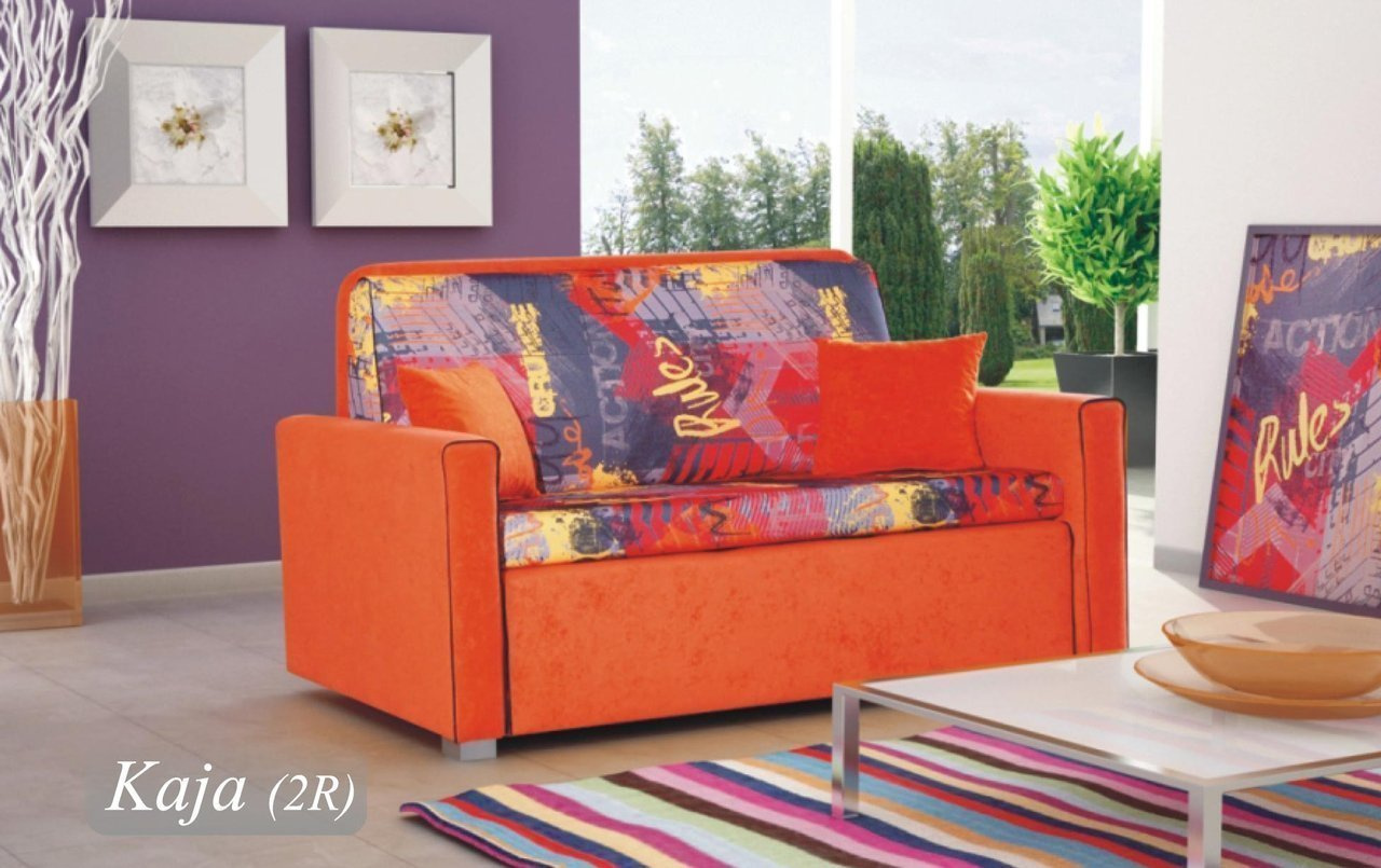 KAJA 2R to sofa dla zdecydowanych i odważnych. Żywe kolory emanują energią. Dobranie odpowiedniej kolorystyki tkanin zadowoli każdego. Zastosowanie pianek wysokoelastycznych typu HR w siedziskach i cześci spania zwiększa komfort użytkownika.